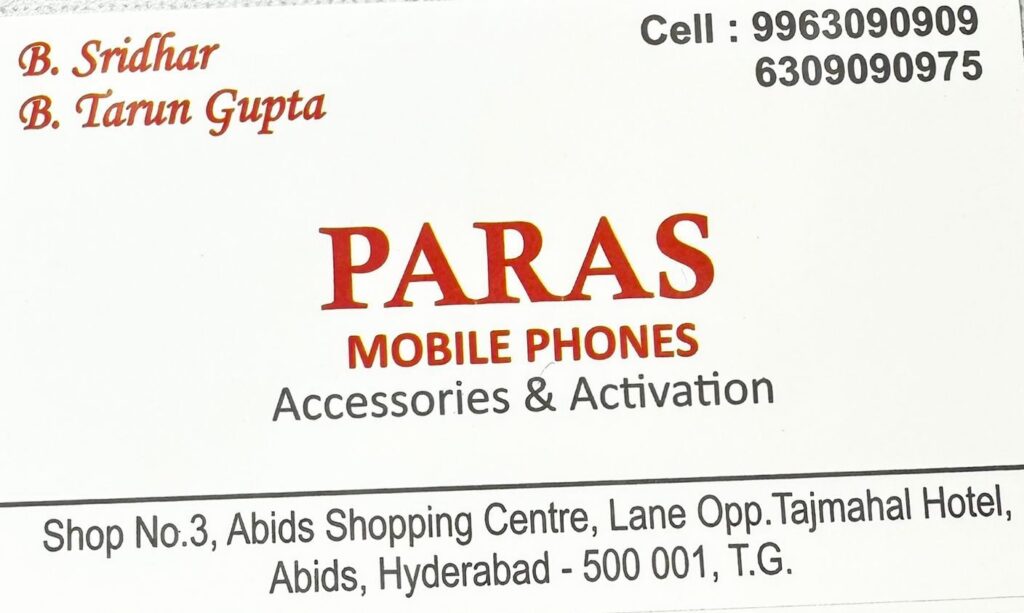 Tarun Gupta Berally Paras Mobiles Mobiles - Sales & Service 6309090975 6309090975 E-Mail ID Web Site URL Route Map Shop No.3,Abids Shopping Centre, Lane Opp. Tajmahal Hotel, Abids, Hyderabad - 500 001.