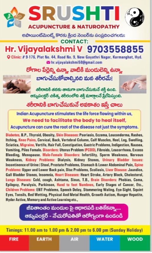 Vijaya Lakshmi Vemula SRUSHTI Acupuncture and Naturopathy 9703558855 9703558855 E-Mail ID Web Site URL Route Map Business Address
